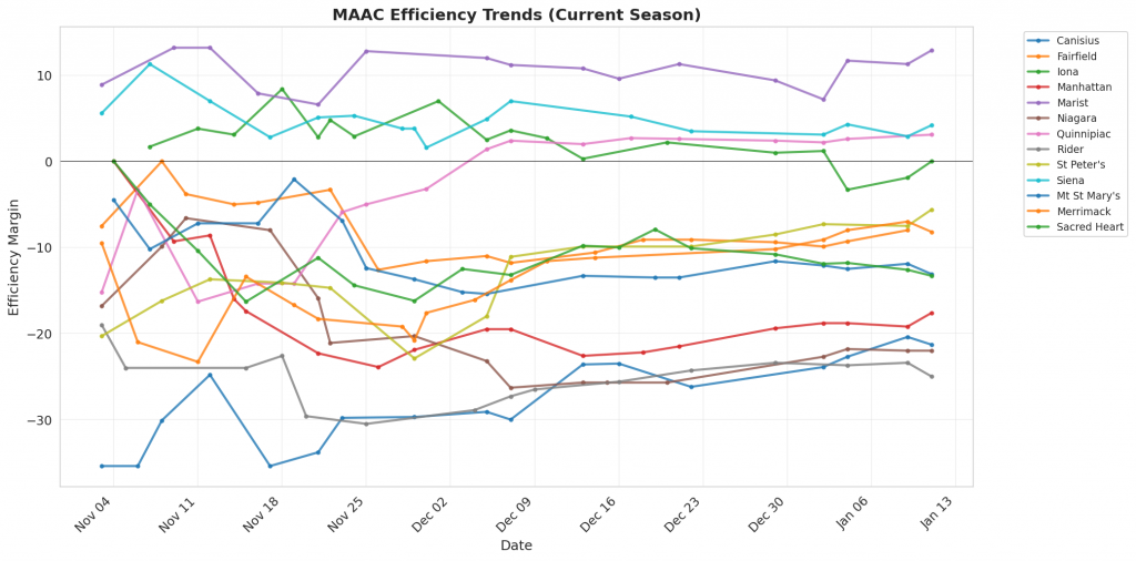Figure 1: Efficiency margin trends for MAAC teams throughout the season. Teams trending upward show improving performance, while downward trends indicate struggles.