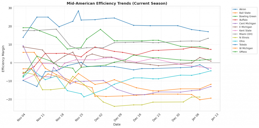 Figure 1: Efficiency margin trends for Mid-American teams throughout the season. Teams trending upward show improving performance, while downward trends indicate struggles.