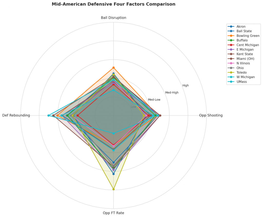 Figure 3: Defensive Four Factors comparison across Mid-American teams. The radar chart shows each team’s opponent shooting defense (Opp eFG%), ball disruption (forcing TOV%), defensive rebounding (DREB%), and opponent free throw prevention (Opp FT Rate).