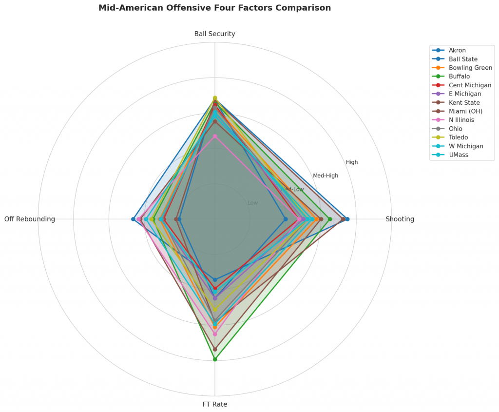 Figure 2: Offensive Four Factors comparison across Mid-American teams. The radar chart shows each team’s shooting efficiency (eFG%), ball security (TOV%), offensive rebounding (OREB%), and free throw generation (FT Rate).
