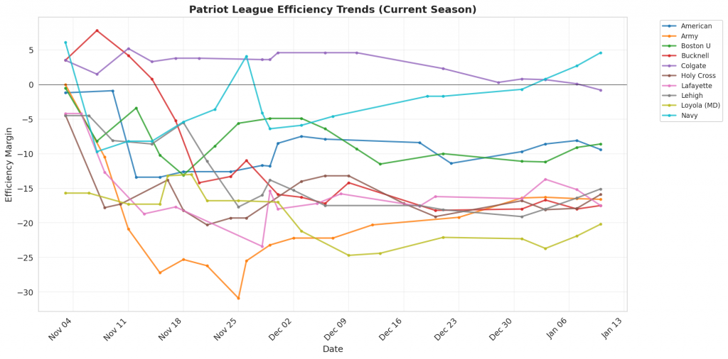 Figure 1: Efficiency margin trends for Patriot League teams throughout the season. Teams trending upward show improving performance, while downward trends indicate struggles.