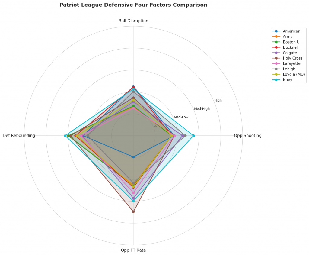 Figure 3: Defensive Four Factors comparison across Patriot League teams. The radar chart shows each team’s opponent shooting defense (Opp eFG%), ball disruption (forcing TOV%), defensive rebounding (DREB%), and opponent free throw prevention (Opp FT Rate).