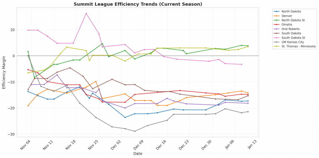 Figure 1: Efficiency margin trends for Summit League teams throughout the season. Teams trending upward show improving performance, while downward trends indicate struggles.