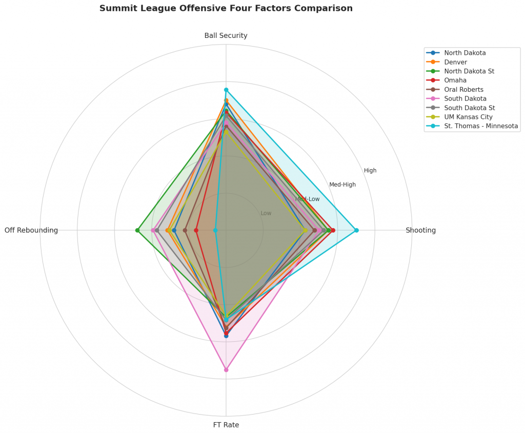 Figure 2: Offensive Four Factors comparison across Summit League teams. The radar chart shows each team’s shooting efficiency (eFG%), ball security (TOV%), offensive rebounding (OREB%), and free throw generation (FT Rate).