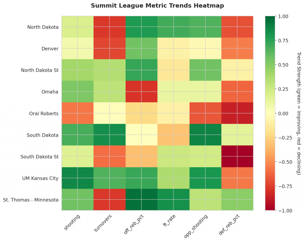 As Summit League teams continue their season, the MACD trending indicators will help identify which teams are genuinely improving versus those riding unsustainable momentum. Check back next week for updated analysis.