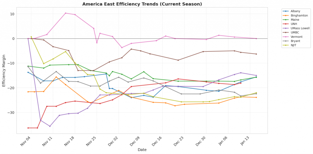 Figure 1: Efficiency margin trends for America East teams throughout the season. Teams trending upward show improving performance, while downward trends indicate struggles.