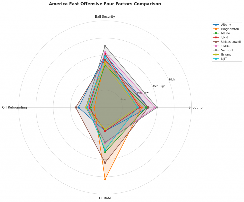 Figure 2: Offensive Four Factors comparison across America East teams. The radar chart shows each team’s shooting efficiency (eFG%), ball security (TOV%), offensive rebounding (OREB%), and free throw generation (FT Rate).
