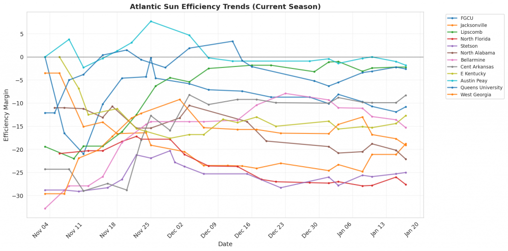 Figure 1: Efficiency margin trends for Atlantic Sun teams throughout the season. Teams trending upward show improving performance, while downward trends indicate struggles.
