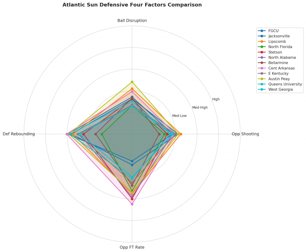 Figure 3: Defensive Four Factors comparison across Atlantic Sun teams. The radar chart shows each team’s opponent shooting defense (Opp eFG%), ball disruption (forcing TOV%), defensive rebounding (DREB%), and opponent free throw prevention (Opp FT Rate).