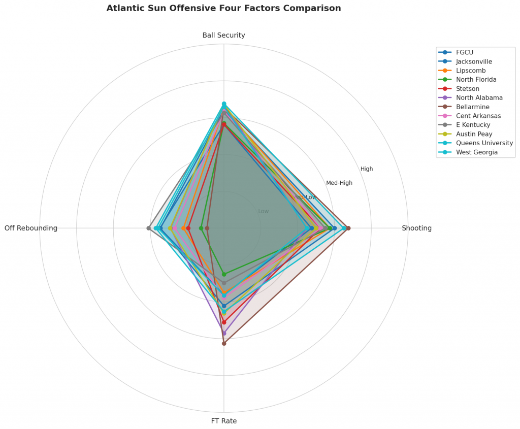 Figure 2: Offensive Four Factors comparison across Atlantic Sun teams. The radar chart shows each team’s shooting efficiency (eFG%), ball security (TOV%), offensive rebounding (OREB%), and free throw generation (FT Rate).