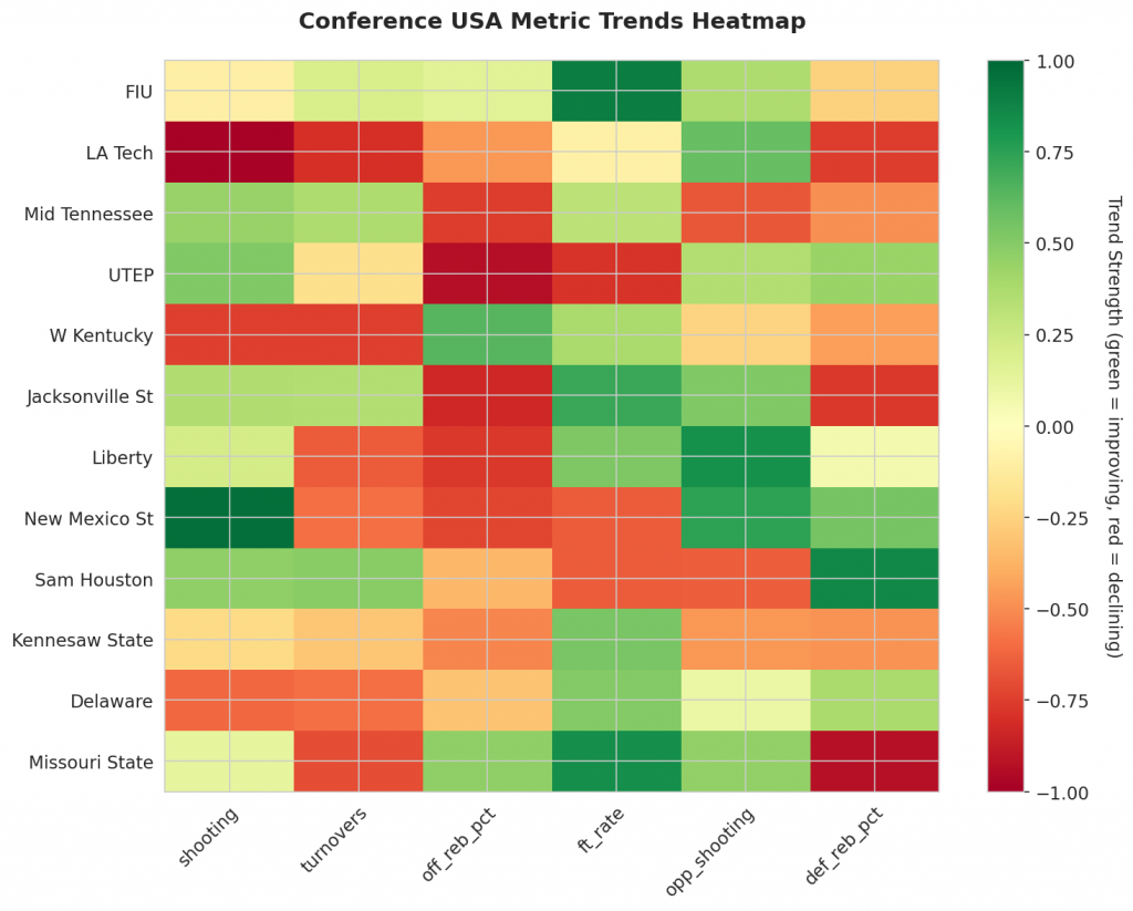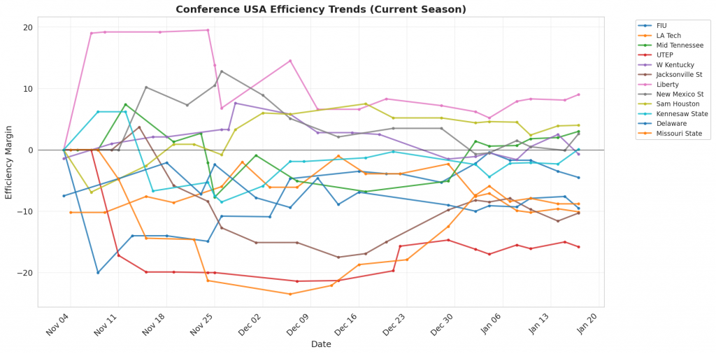 Figure 1: Efficiency margin trends for Conference USA teams throughout the season. Teams trending upward show improving performance, while downward trends indicate struggles.