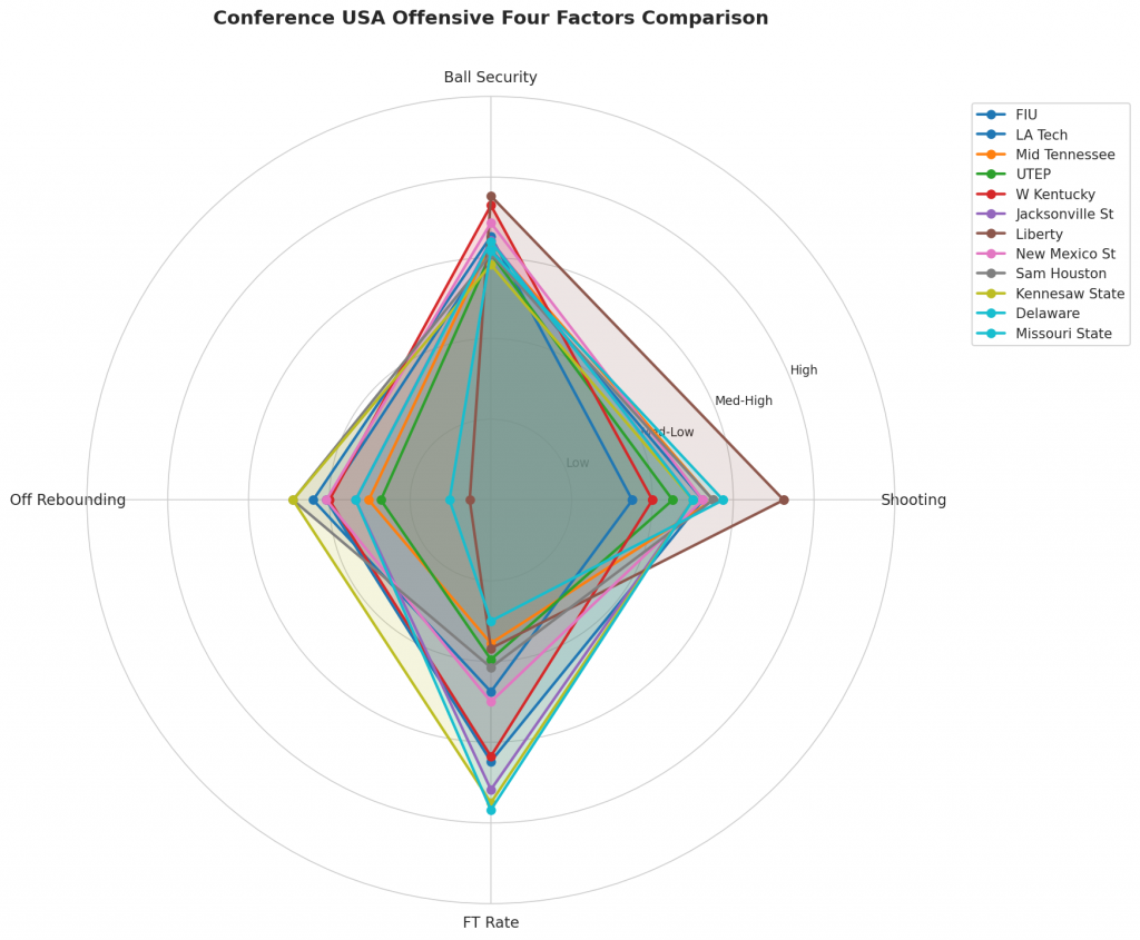 Figure 2: Offensive Four Factors comparison across Conference USA teams. The radar chart shows each team’s shooting efficiency (eFG%), ball security (TOV%), offensive rebounding (OREB%), and free throw generation (FT Rate).