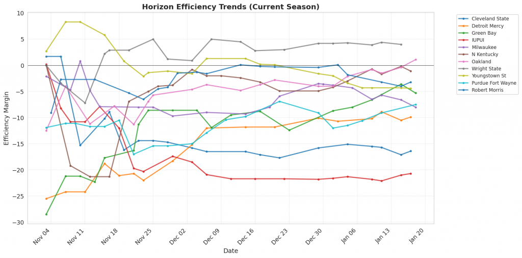 Figure 1: Efficiency margin trends for Horizon teams throughout the season. Teams trending upward show improving performance, while downward trends indicate struggles.