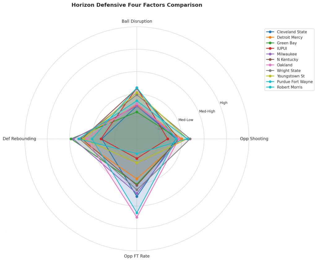 Figure 3: Defensive Four Factors comparison across Horizon teams. The radar chart shows each team’s opponent shooting defense (Opp eFG%), ball disruption (forcing TOV%), defensive rebounding (DREB%), and opponent free throw prevention (Opp FT Rate).