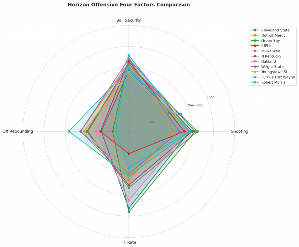 Figure 2: Offensive Four Factors comparison across Horizon teams. The radar chart shows each team’s shooting efficiency (eFG%), ball security (TOV%), offensive rebounding (OREB%), and free throw generation (FT Rate).