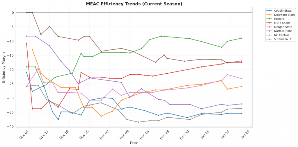 Figure 1: Efficiency margin trends for MEAC teams throughout the season. Teams trending upward show improving performance, while downward trends indicate struggles.