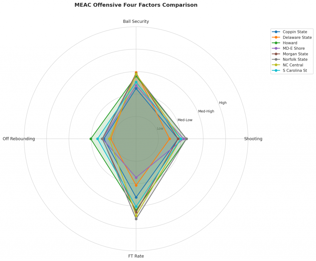 Figure 2: Offensive Four Factors comparison across MEAC teams. The radar chart shows each team’s shooting efficiency (eFG%), ball security (TOV%), offensive rebounding (OREB%), and free throw generation (FT Rate).
