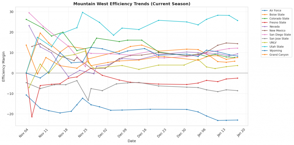 Figure 1: Efficiency margin trends for Mountain West teams throughout the season. Teams trending upward show improving performance, while downward trends indicate struggles.