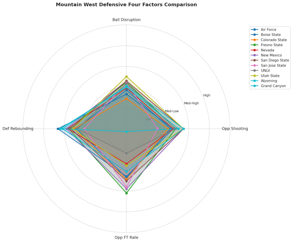 Figure 3: Defensive Four Factors comparison across Mountain West teams. The radar chart shows each team’s opponent shooting defense (Opp eFG%), ball disruption (forcing TOV%), defensive rebounding (DREB%), and opponent free throw prevention (Opp FT Rate).