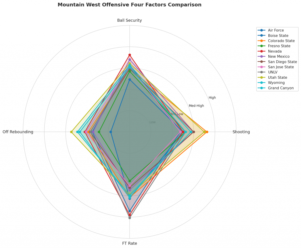 Figure 2: Offensive Four Factors comparison across Mountain West teams. The radar chart shows each team’s shooting efficiency (eFG%), ball security (TOV%), offensive rebounding (OREB%), and free throw generation (FT Rate).