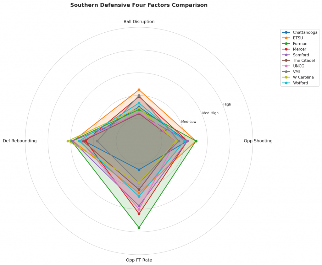 Figure 3: Defensive Four Factors comparison across Southern teams. The radar chart shows each team’s opponent shooting defense (Opp eFG%), ball disruption (forcing TOV%), defensive rebounding (DREB%), and opponent free throw prevention (Opp FT Rate).