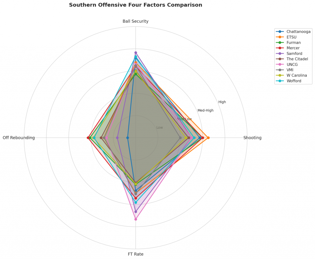 Figure 2: Offensive Four Factors comparison across Southern teams. The radar chart shows each team’s shooting efficiency (eFG%), ball security (TOV%), offensive rebounding (OREB%), and free throw generation (FT Rate).