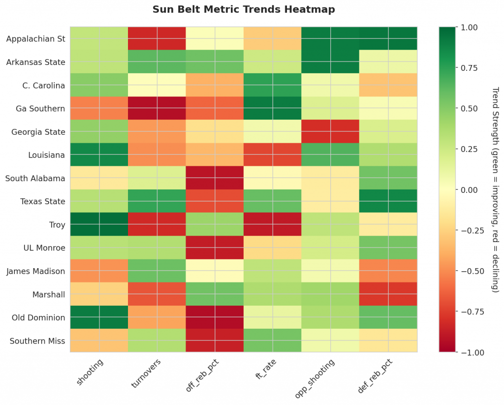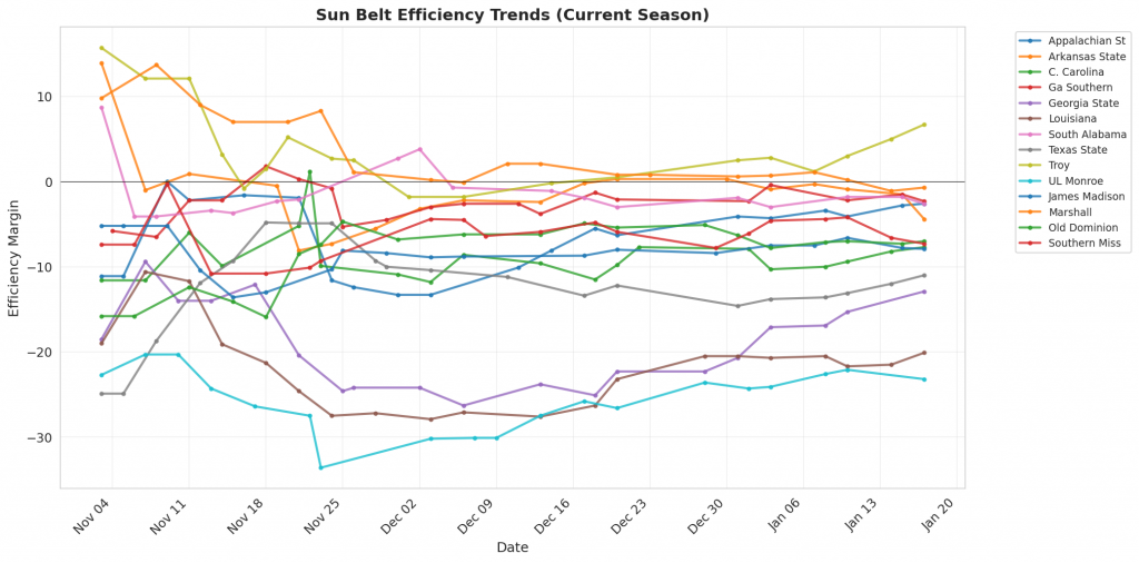 Figure 1: Efficiency margin trends for Sun Belt teams throughout the season. Teams trending upward show improving performance, while downward trends indicate struggles.