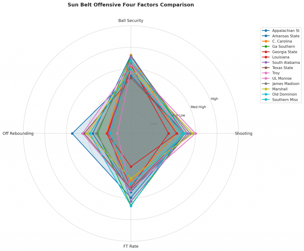 Figure 2: Offensive Four Factors comparison across Sun Belt teams. The radar chart shows each team’s shooting efficiency (eFG%), ball security (TOV%), offensive rebounding (OREB%), and free throw generation (FT Rate).