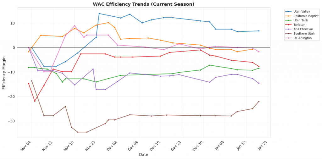 Figure 1: Efficiency margin trends for WAC teams throughout the season. Teams trending upward show improving performance, while downward trends indicate struggles.