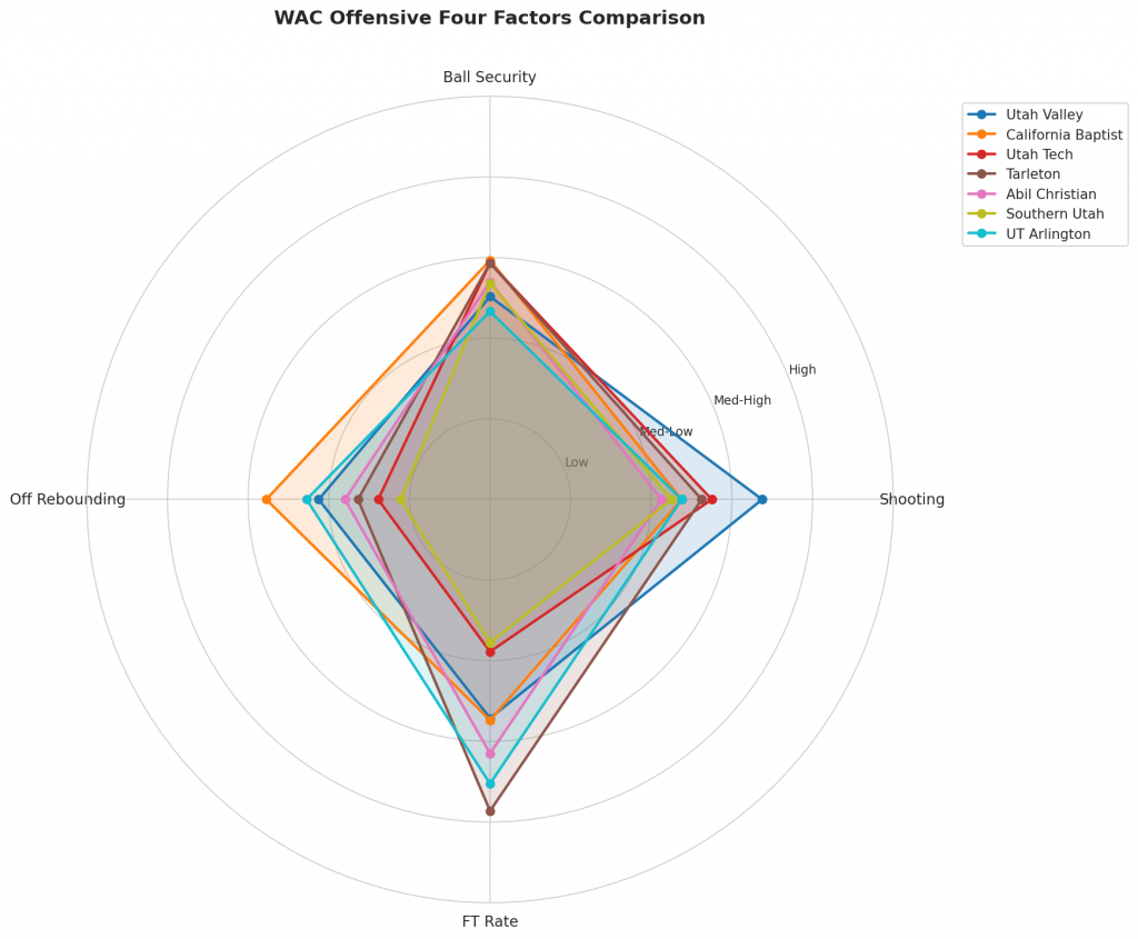 Figure 2: Offensive Four Factors comparison across WAC teams. The radar chart shows each team’s shooting efficiency (eFG%), ball security (TOV%), offensive rebounding (OREB%), and free throw generation (FT Rate).