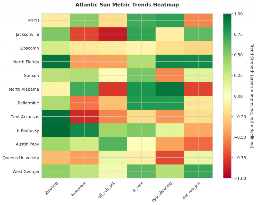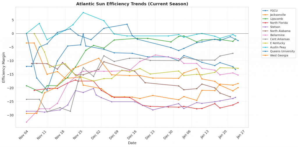 Figure 1: Efficiency margin trends for Atlantic Sun teams throughout the season. Teams trending upward show improving performance, while downward trends indicate struggles.
