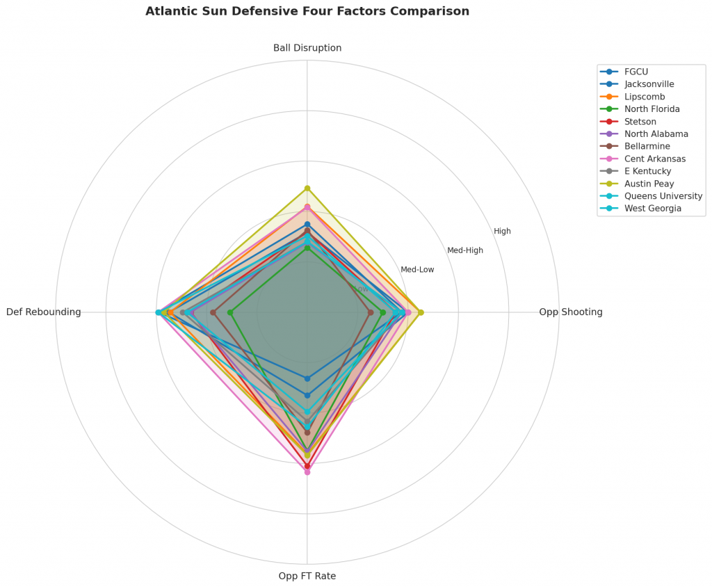 Figure 3: Defensive Four Factors comparison across Atlantic Sun teams. The radar chart shows each team’s opponent shooting defense (Opp eFG%), ball disruption (forcing TOV%), defensive rebounding (DREB%), and opponent free throw prevention (Opp FT Rate).