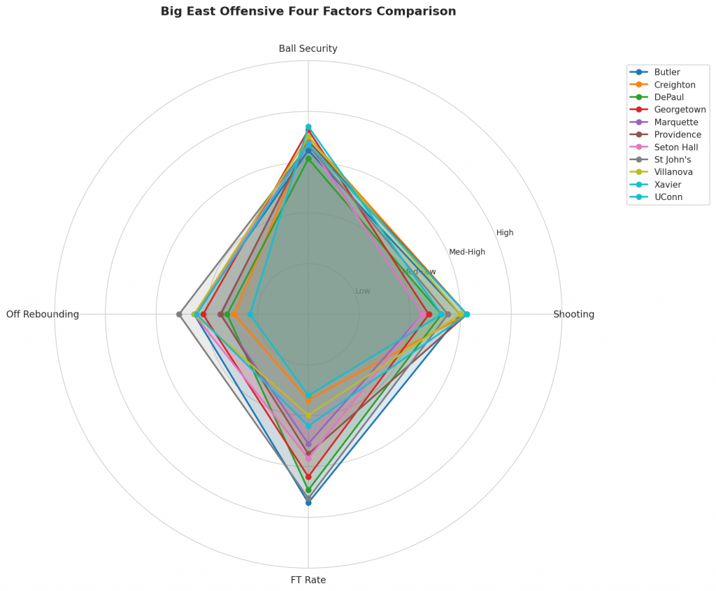 Figure 2: Offensive Four Factors comparison across Big East teams. The radar chart shows each team’s shooting efficiency (eFG%), ball security (TOV%), offensive rebounding (OREB%), and free throw generation (FT Rate).