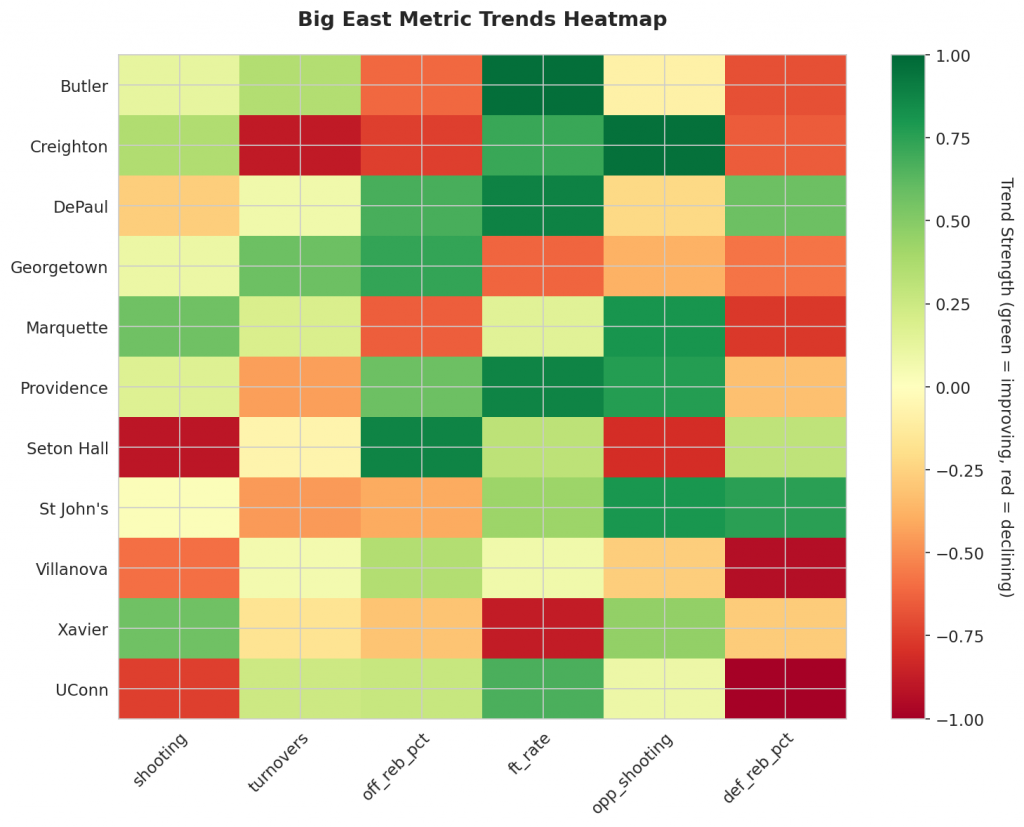 As we conclude Week 12 of Big East action, let’s examine the key offensive and defensive trends that will shape the remainder of the season. Our analysis focuses on the teams’ momentum indicators, revealing which squads are genuinely improving versus those experiencing unsustainable success.