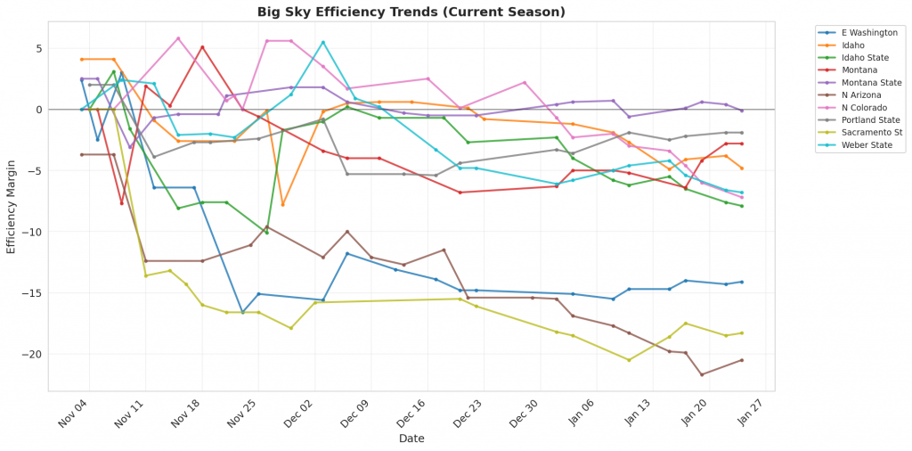 Figure 1: Efficiency margin trends for Big Sky teams throughout the season. Teams trending upward show improving performance, while downward trends indicate struggles.