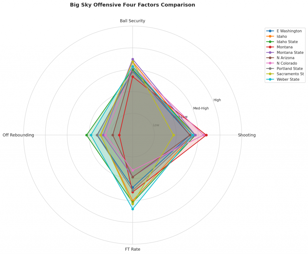 Figure 2: Offensive Four Factors comparison across Big Sky teams. The radar chart shows each team’s shooting efficiency (eFG%), ball security (TOV%), offensive rebounding (OREB%), and free throw generation (FT Rate).