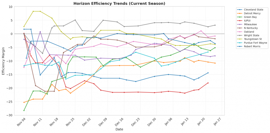 Figure 1: Efficiency margin trends for Horizon teams throughout the season. Teams trending upward show improving performance, while downward trends indicate struggles.
