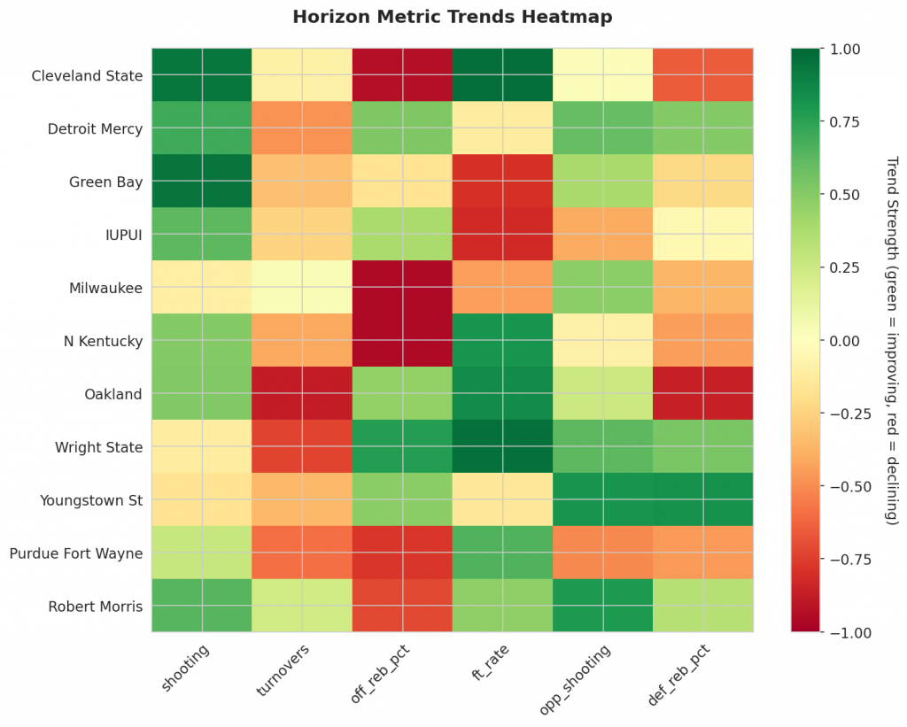 Three teams stand out for their improvements on the offensive side of the ball: Cleveland State, Detroit Mercy, and Green Bay. All three have seen significant upticks in shooting percentage, with Cleveland State boasting an average of 0.54 (trending up strongly) and Green Bay averaging 0.55 (also trending up strongly). Detroit Mercy’s shooting percentage has improved to 0.48 (up strongly as well).
