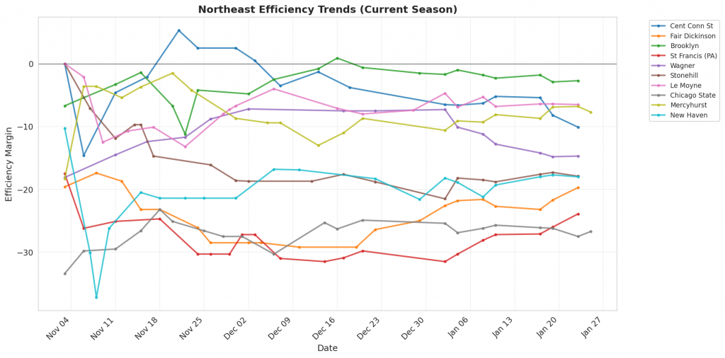 Figure 1: Efficiency margin trends for Northeast teams throughout the season. Teams trending upward show improving performance, while downward trends indicate struggles.