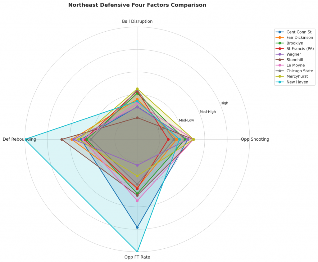 Figure 3: Defensive Four Factors comparison across Northeast teams. The radar chart shows each team’s opponent shooting defense (Opp eFG%), ball disruption (forcing TOV%), defensive rebounding (DREB%), and opponent free throw prevention (Opp FT Rate).