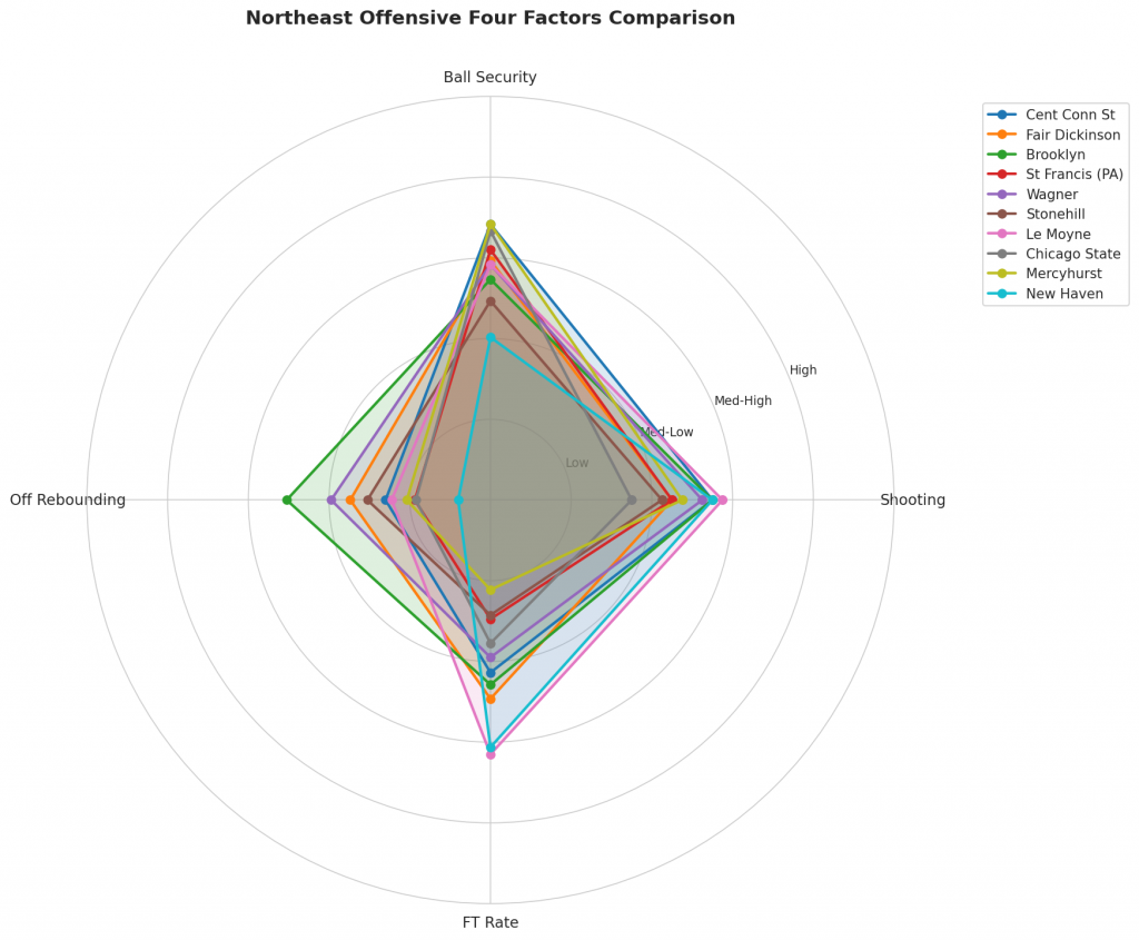 Figure 2: Offensive Four Factors comparison across Northeast teams. The radar chart shows each team’s shooting efficiency (eFG%), ball security (TOV%), offensive rebounding (OREB%), and free throw generation (FT Rate).