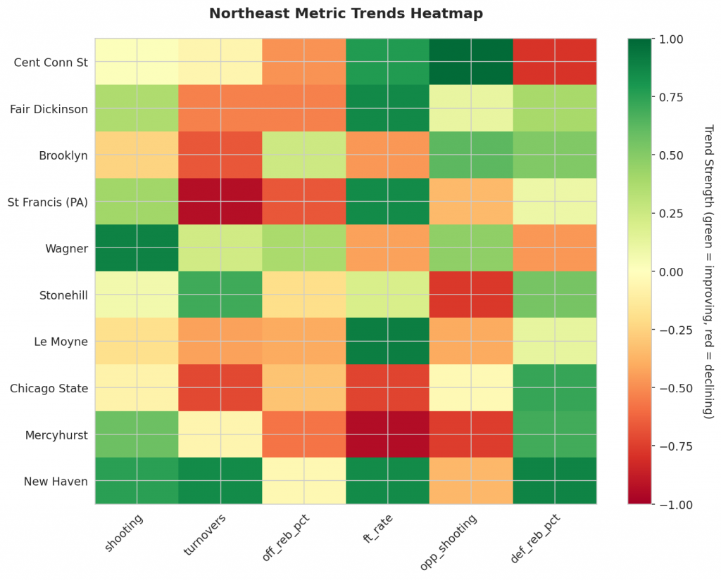 The Northeast continues to showcase its competitiveness in college basketball, with several teams displaying notable trends. Our analysis highlights key offensive and defensive metrics that reveal areas of improvement and decline.