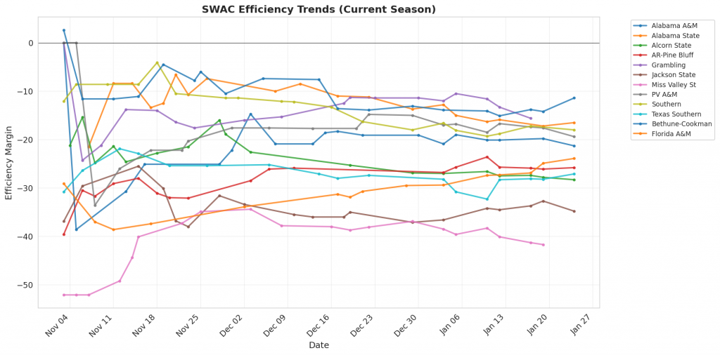 Figure 1: Efficiency margin trends for SWAC teams throughout the season. Teams trending upward show improving performance, while downward trends indicate struggles.