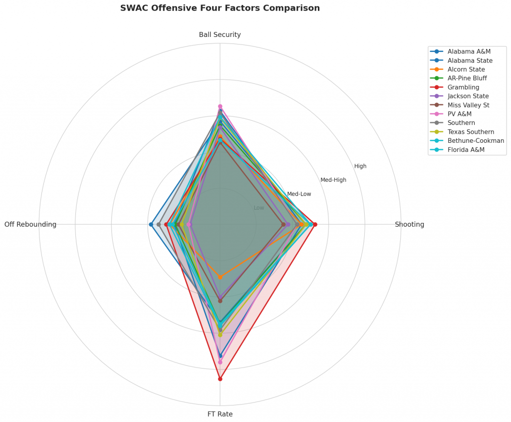 Figure 2: Offensive Four Factors comparison across SWAC teams. The radar chart shows each team’s shooting efficiency (eFG%), ball security (TOV%), offensive rebounding (OREB%), and free throw generation (FT Rate).
