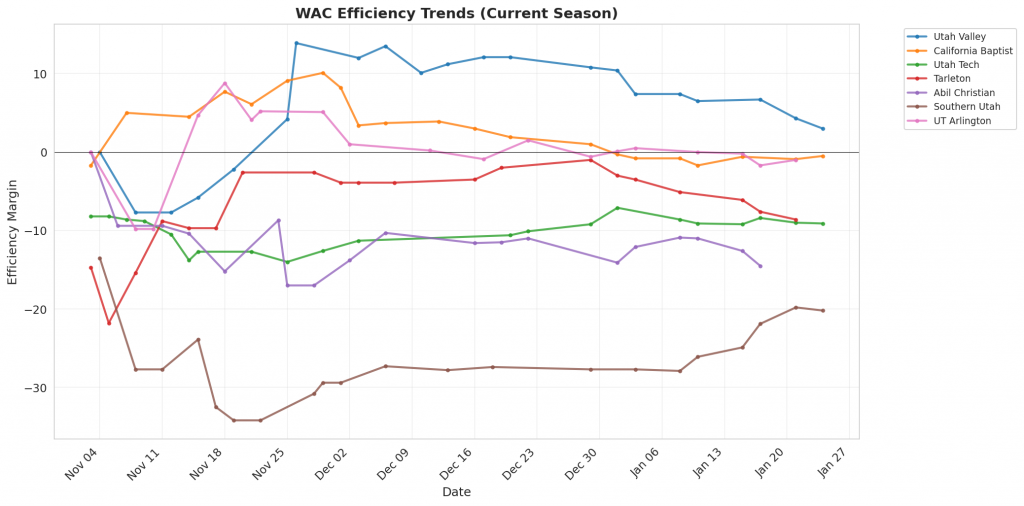 Figure 1: Efficiency margin trends for WAC teams throughout the season. Teams trending upward show improving performance, while downward trends indicate struggles.