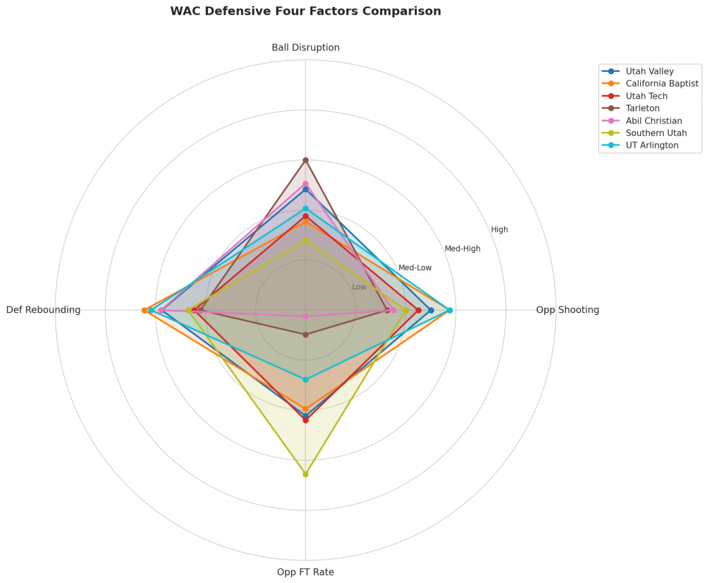 Figure 3: Defensive Four Factors comparison across WAC teams. The radar chart shows each team’s opponent shooting defense (Opp eFG%), ball disruption (forcing TOV%), defensive rebounding (DREB%), and opponent free throw prevention (Opp FT Rate).