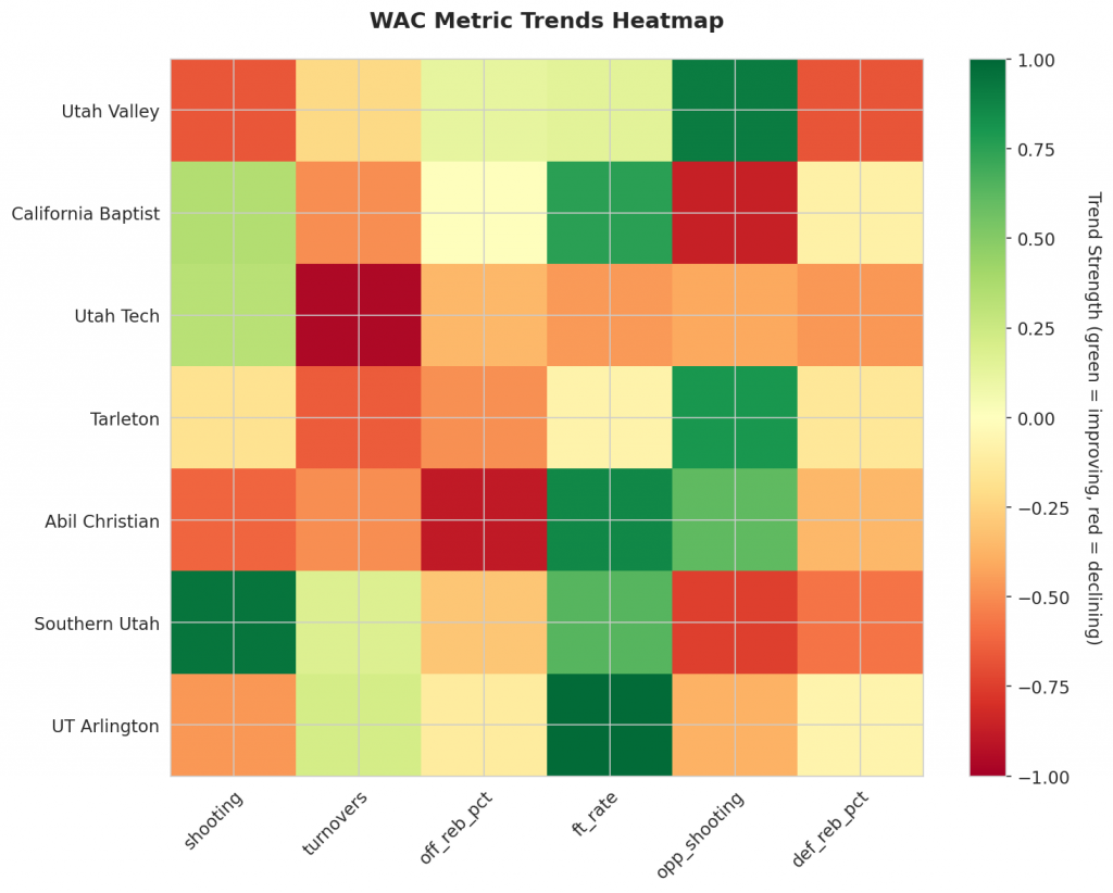 Utah Valley faces challenges on both ends of the court, as its offense struggles with declining shooting and its defense grapples with worsening rebounding efficiency. Meanwhile, Southern Utah’s shooting improvement could provide a boost to its offense, while California Baptist and Utah Tech are experiencing defensive upgrades.