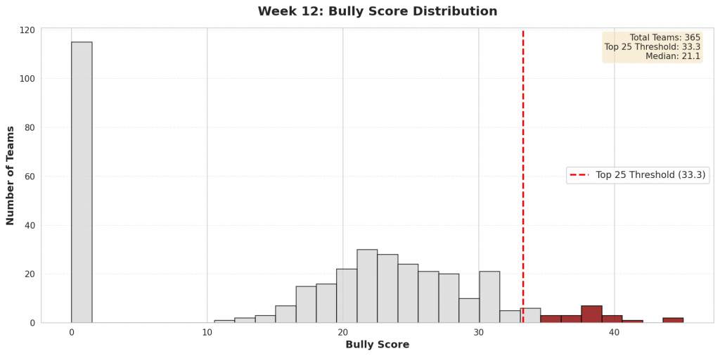 Figure 4: Distribution of bully scores across all Division I teams. The top 25 bullies (highlighted in red) represent teams whose efficiency metrics are most inflated by their performance patterns.