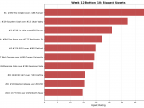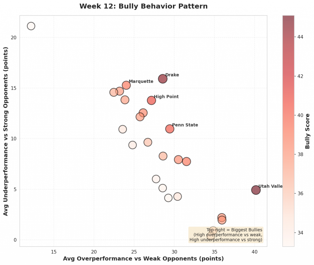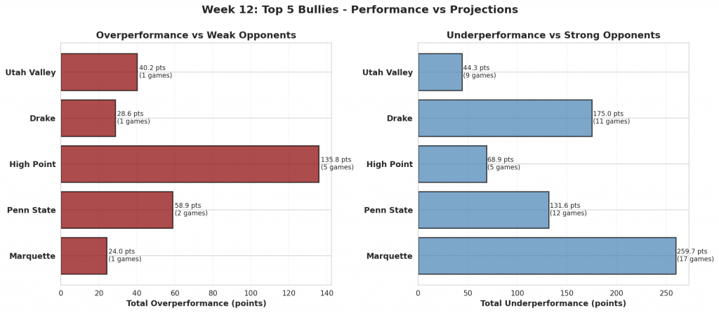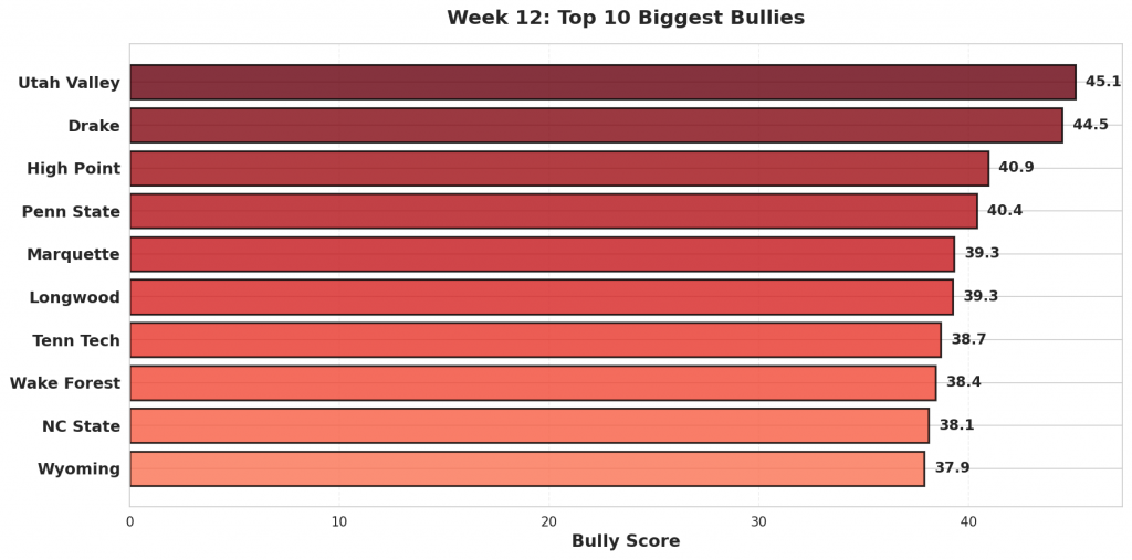 Figure 1: Top 10 teams with the highest bully scores in Week 12. Bully scores reflect the combination of overperformance against weak opponents and underperformance against quality competition.