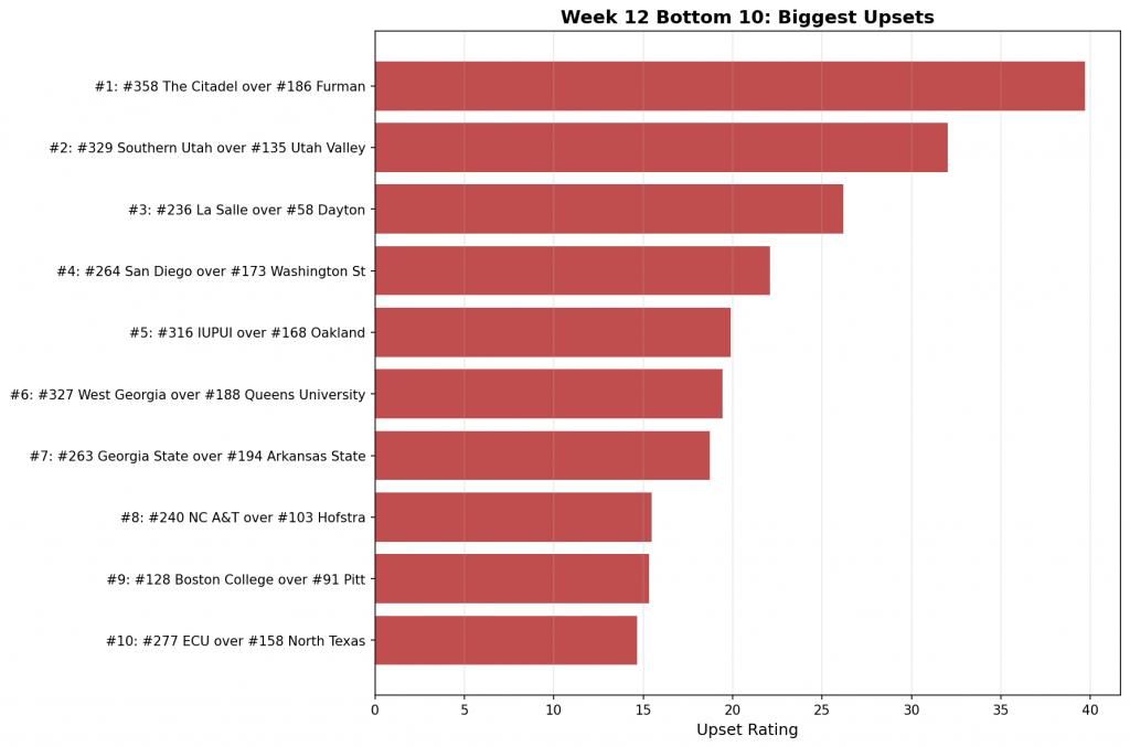 To quantify the surprise in each game, we used the Upset Rating metric, which measures the degree of surprise based on the difference between the teams’ pre-game rankings and their performance on the court. The highest rated upset was #358 The Citadel’s win over #186 Furman, with an Upset Rating of 39.7. This indicates that this particular outcome was one of the most unexpected.
